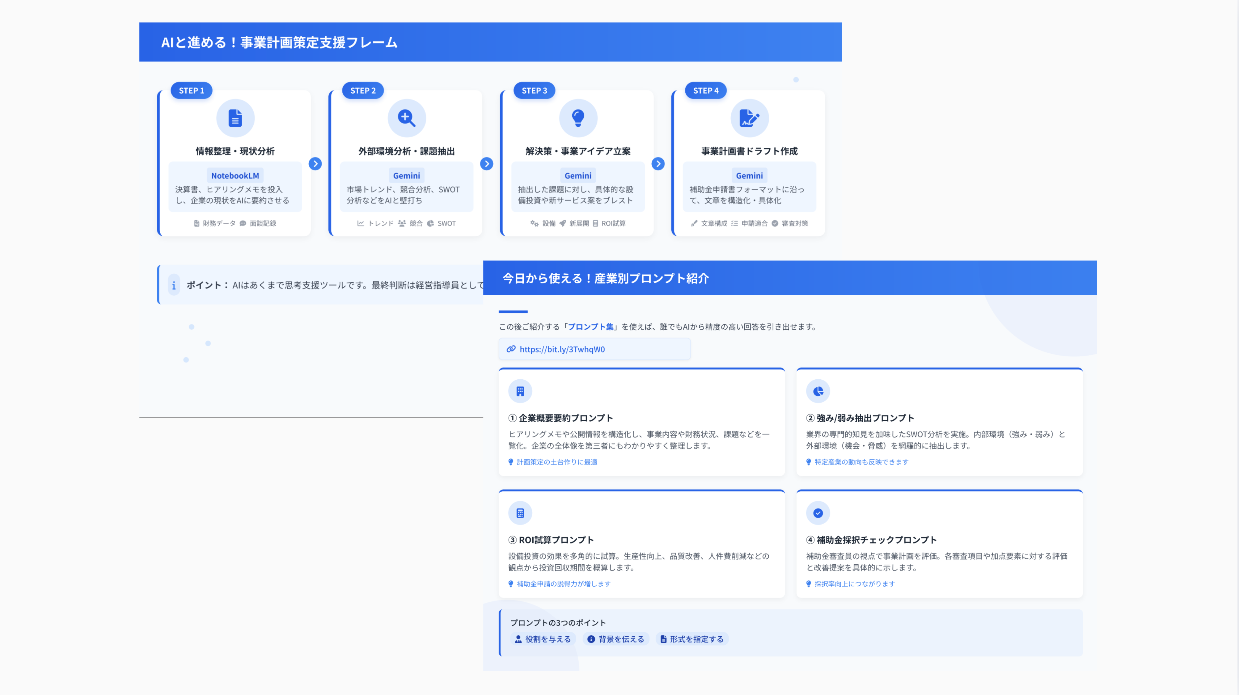 生成AIを業務に活かす実践型セミナーです。 Geminiで自分専用AIを作り、Perplexity・NotebookLM・Gensparkで事業計画書をAI作成。 最後に、明日から使える活用計画を立てます。初心者でも実務で使える内容です。 |